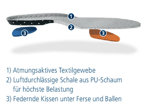 Die anatomisch geformte Fußstütze aus dämpfendem PU-Schaum sorgt für optimalen Komfort. Eine eingearbeitete Mittelfußpelotte und ein stoßabsorbierendes Fersenpolster unterstützen den Fuß gezielt bei sportlichen Aktivitäten. Hochwertige Verarbeitung garantiert eine lange Lebensdauer.