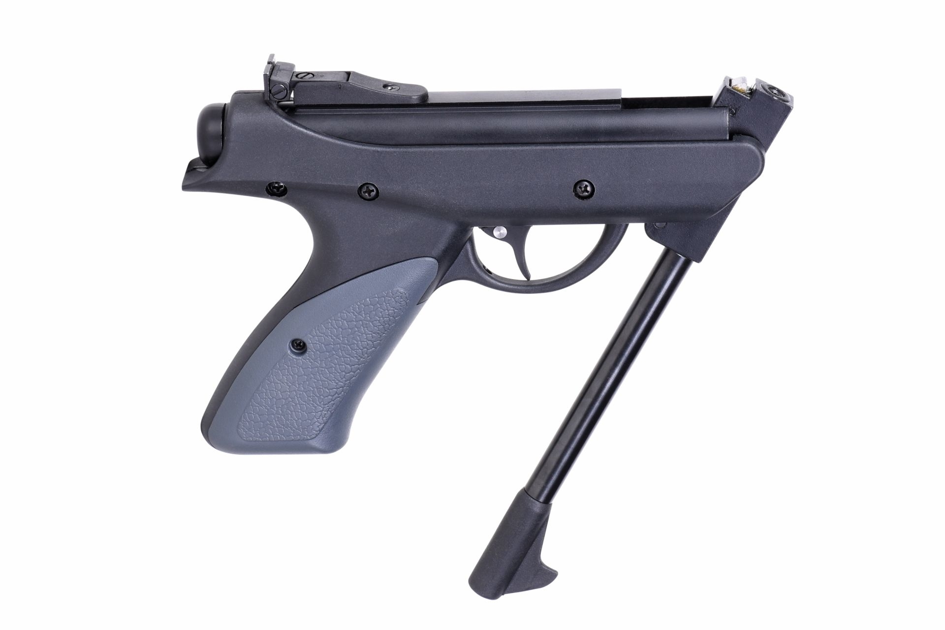Die DIANA p-five Knicklauf-Pistole verfügt über eine gefräste Prismenschiene zur einfachen Anbringung von Zielhilfen, eine einstellbare hintere Visierung sowie eine manuelle Sicherung.