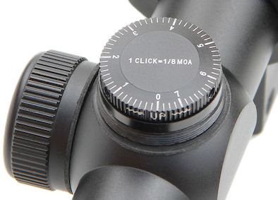 - Klickverstellung: 1 Klick = 1⁄8 MOA = 1,85 mm auf 50 m, 3,7 mm auf 100 m